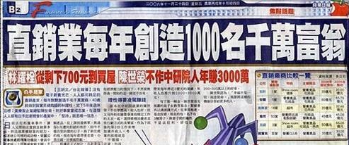 沒有電子新貴光芒,人人都可跨足的直銷產業,每年默默創造千名千萬富翁,40歲就做到賀寶芙總裁級的林躍栓,定下5年後退休目標;美樂家企業總監陳世榮,則把事業當成志業。在這個人人都有白手起家機會的產業中,「堅持」就是唯一信念。(轉載自蘋果日報2006年11月24日【王妍文╱台北報導】)